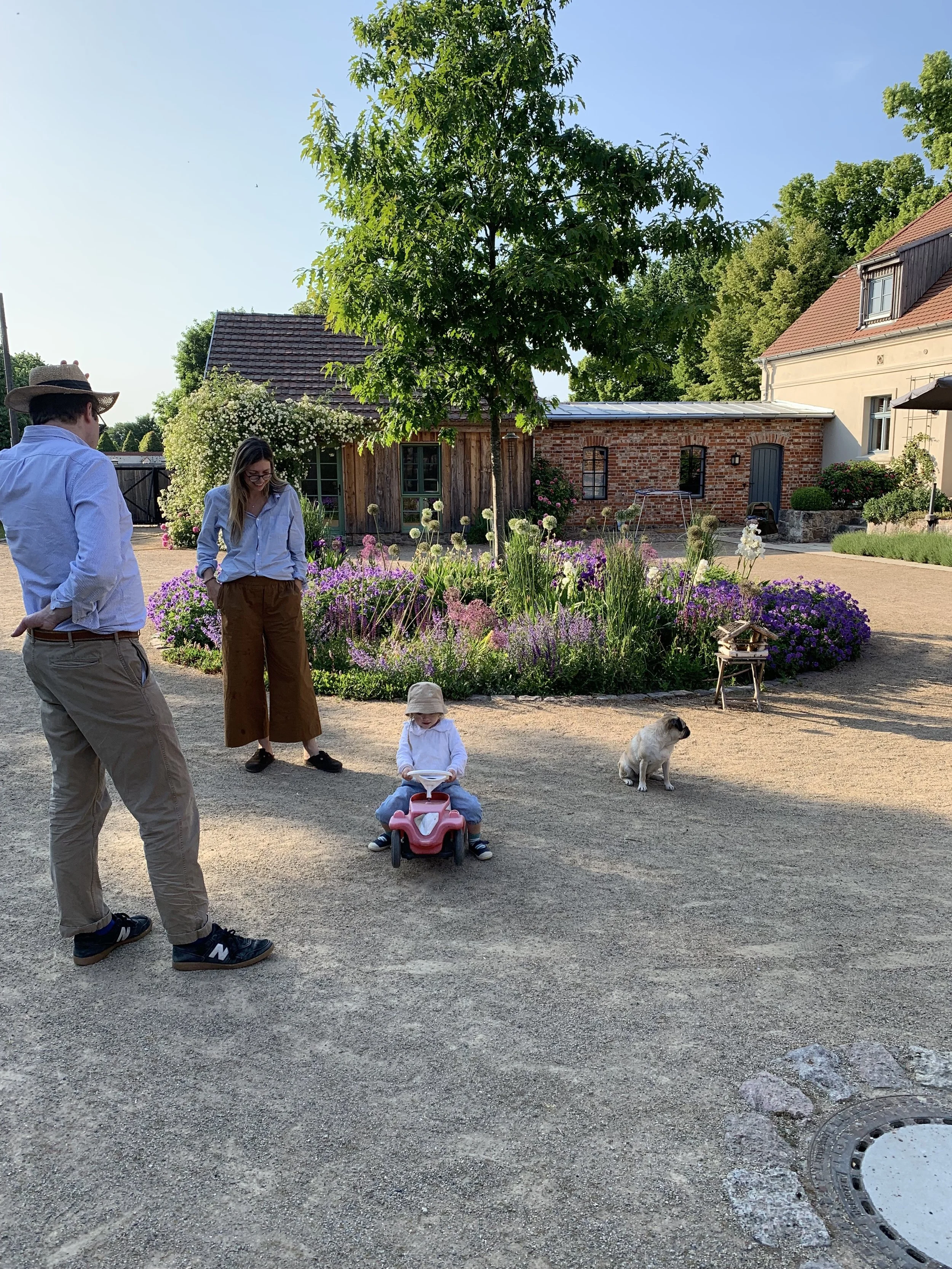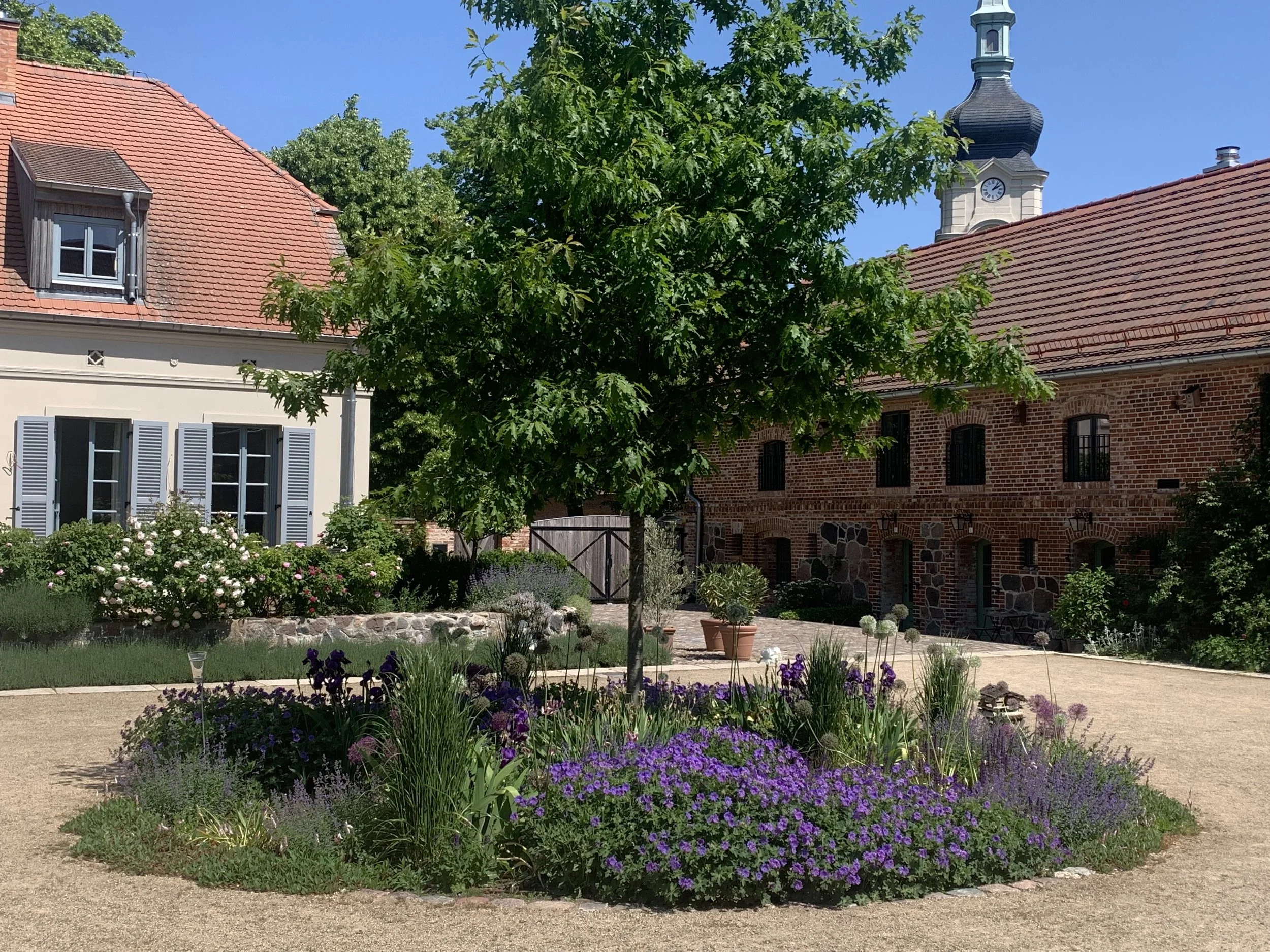 Am Rande des Dorfes – direkt gegenüber von Schloß Meseberg – liegt unser Vierseithof. Wir haben ihn vor einigen Jahren gekauft und seitdem sehr viel Liebe und Arbeit hinein gesteckt. Mittlerweile sind alle Gebäude hergerichtet, die Ferienwohnungen werden sehr gelobt und die Blumen in den Beeten sind wunderbar gewachsen.